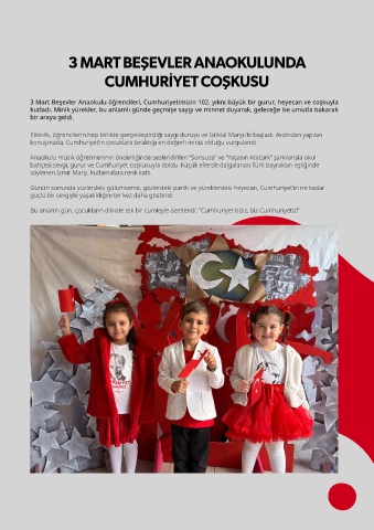 3 Mart Beşevler Anaokulu öğrencileri, Cumhuriyetimizin 102. yılını büyük bir gurur, heyecan ve coşkuyla