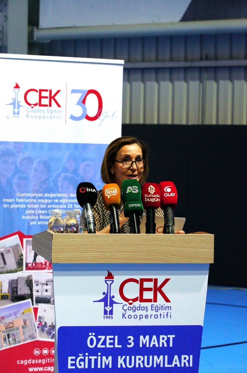 Törenin açılışında konuşan ÇEK Yönetim Kurulu Başkanı Nihan Alpay, kuruldukları ilk günden bu yana, "Eğitimde fırsat eşitliği" ilkesiyle çocukların ve gençlerin akademik başarılarının yanı sıra, sosyal, kültürel ve sportif gelişimlerini de destekleyen projeleri hayata geçirme hedefiyle durmaksızın çalıştıklarını belirtti. ÇEK Spor Salonunun da bu anlayışın somut örneklerinden biri olarak geçtiğimiz aralık ayında tamamlandığını hatırlatan Nihan Alpay, "İmece ruhuyla, bağışçılarımızın güçlü desteğiyle, ÇEK dostlarımızın inancıyla ve çalışanlarımızın özverisiyle bir hayali daha gerçeğe dönüştürme şansı bulduk. Bu süreçte yanımızda yürüyen tüm paydaşlarımıza gönülden teşekkür ediyorum." dedi. Alpay, şöyle devam etti: