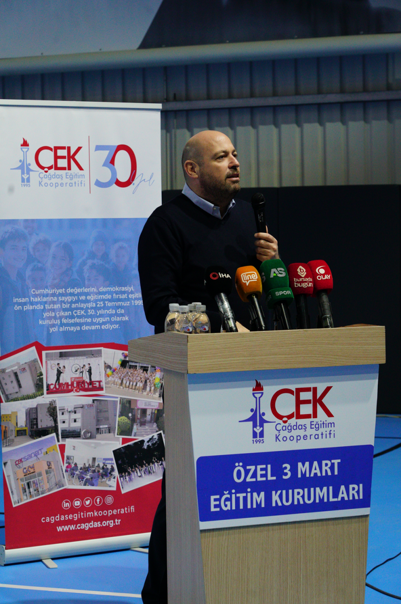 "2000-2002 yılları arasında Çağdaş Eğitim Kooperatifi Yönetim Kurulu Başkanlığı'nı yürüten, aynı zamanda Uludağ Üniversitesi geçmiş dönem Rektörlüğü görevini de üstlenen merhum Prof. Dr. Ayhan Kızıl'ı da bu vesileyle rahmetle anıyorum. Bugün de gördüğümüz üzere Kızıl Ailesi değerli destekleriyle her zaman bizlerin yanında olmaya devam ediyor. Bu tesis sadece spor salonu kimliği taşıyan bir bina değil; aynı zamanda çocuklarımızın özgüven kazanacağı, disiplin geliştireceği, takım ruhunu öğreneceği ve sağlıklı bir yaşam kültürü edineceği bir eğitim birimidir. Spor salonumuzdan, okullarımızın kullandığı saatler dışındaki zamanlarda da katma değer üretecek şekilde faydalanmayı amaçlıyoruz. Salonumuzu bu amaç doğrultusunda sürdürülebilir gelir kaynağına dönüştürerek, buradan elde edeceğimiz gelirle çok daha fazla öğrencinin hayatına dokunacak Tam Bursluluk Programımıza destek sağlamayı hedefliyoruz. Geleceğin aydınlık nesillerini yetiştirmeye dönük proje ve çalışmalarımızın bundan sonra da devam edeceğimizi ifade ederek, katılımlarınızdan dolayı sizlere teşekkür ediyor, Kızıl Ailesi'ne de bu değerli bağışlarından dolayı teşekkürlerimi sunuyorum."
