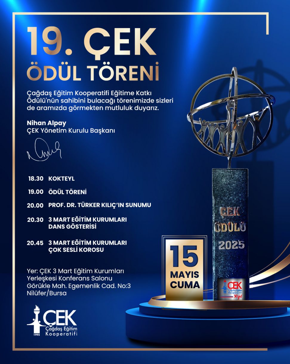 Çağdaş Eğitim Kooperatifinin 23 aydın tarafından 1995 yılında kurulduğunu ve geçtiğimiz yıl 30. kuruluş yıl dönümünü geride bıraktığını ifade eden ÇEK Yönetim Kurulu Başkanı Nihan Alpay, ilki 2006 yılında düzenlenen ÇEK Ödül Töreni'nin bu yıl 19'uncusunu organize edecek olmaktan dolayı mutlu olduklarını ifade etti. Yönetim Kurulunca yapılan değerlendirme ile ÇEK Eğitime Katkı Ödülü'nü Prof. Dr. Türker Kılıç'a takdim edeceklerini dile getiren Alpay, "Sayın Kılıç, beyin cerrahisi profesörü ve beyni anlamaya çalışan bir bilim insanı. 1966 yılında Bursa'da dünyaya gelen Kılıç, Bursa Anadolu Lisesindeki eğitiminin ardından Tıp eğitimini Hacettepe Üniversitesinde, uzmanlık eğitimini de Marmara Üniversitesi Nöroşirürji Anabilim Dalında tamamlamıştır. Bilimsel araştırmalarıyla kendi alanındaki çok sayıda ulusal ve uluslararası dernek ve birlik tarafından birbirinden değerli araştırma ve bilimsel çalışma ödülüne layık görülen Prof. Dr. Kılıç, Marmara Üniversitesi Tıp Fakültesi öğrencileri tarafından 2000 yılında 'Araştırmaya En Fazla Teşvik Eden Öğretim Üyesi' seçilmiştir. Prof. Dr. Kılıç, mikrocerrahi ve gamma-knife cerrahisi yöntemleri ile toplamda 30.000 üzeri sayıdaki hastasının cerrahi tedavilerini gerçekleştirmiş, bu süreçte 49 öğrencisinin beyin cerrahı olarak yetişmesinde, 400'ün üzerinde tıp öğrencisinin hekim olmasında rol sahibi olmuştur. Prof. Dr. Kılıç, tüm bu yetkinliklerinin yanı sıra, özellikle tıp dünyasına yeni beyin cerrahları ve hekimler kazandırılmasında oynadığı değerli rol nedeniyle Yönetim Kurulumuzca ödüle layık görülmüştür." şeklinde konuştu.