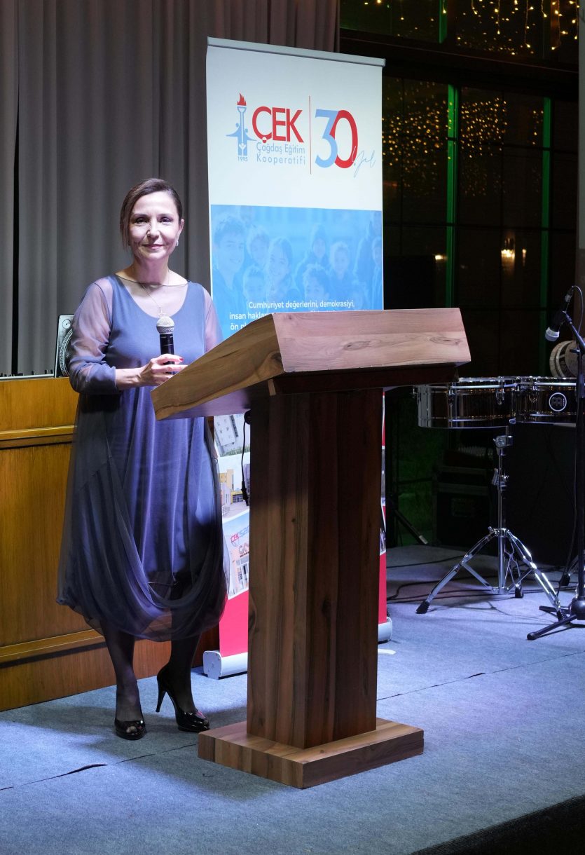 ÇEK Çalışanları Yemek Programı ve Plaket Töreni, 3 Mart'ta ÇEK Ailesinin gerçekleştirdiği Anıtkabir ziyaretine ait görüntüler eşliğinde başladı. Gecenin açılışında konuşan ÇEK Yönetim Kurulu Başkanı Nihan Alpay, aynı çatı altında emek veren, aynı idealleri paylaşan büyük bir ailenin üyeleri olarak bir araya gelmenin mutluluğunu yaşadığını ifade etti. Çağdaş Eğitim Kooperatifinin yalnızca 30 yılı geride bırakmış bir kurum değil; ortak değerlerin, dayanışmanın ve geleceğe duyulan inancın somut bir ifadesi olduğunu ifade eden Nihan Alpay, "Bu yapıyı güçlü kılan en önemli unsur sizlersiniz. Her biriniz, görev yaptığınız alanda gösterdiğiniz özveri, sorumluluk bilinci ve samimi katkılarla bu büyük yapının temel taşlarını oluşturuyorsunuz." şeklinde konuştu.